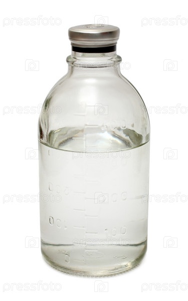 Медицинская бутылка с бесцветной жидкостью на белом фоне