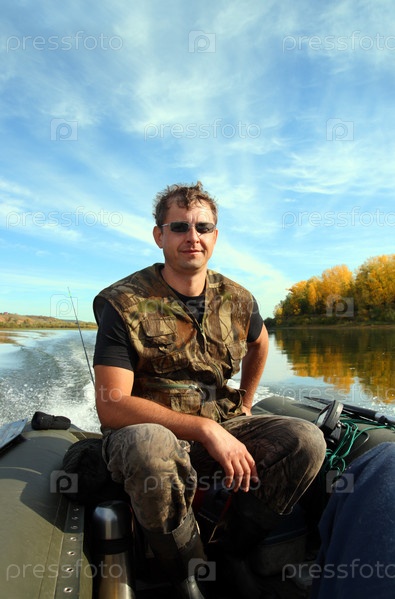 Рыбак плывет по реке на резиновой лодке
