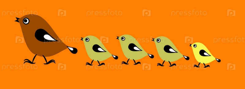 Птичка ведет за собой своих птенцов