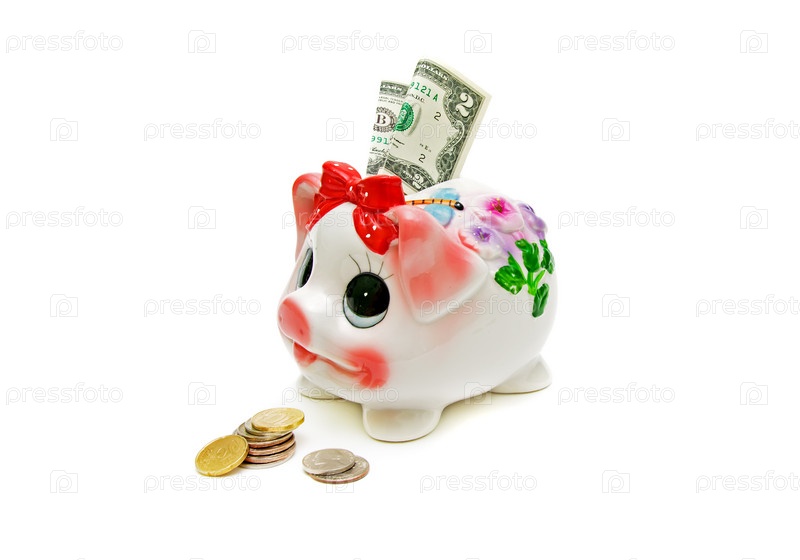 Копилка с деньгами на белом фоне