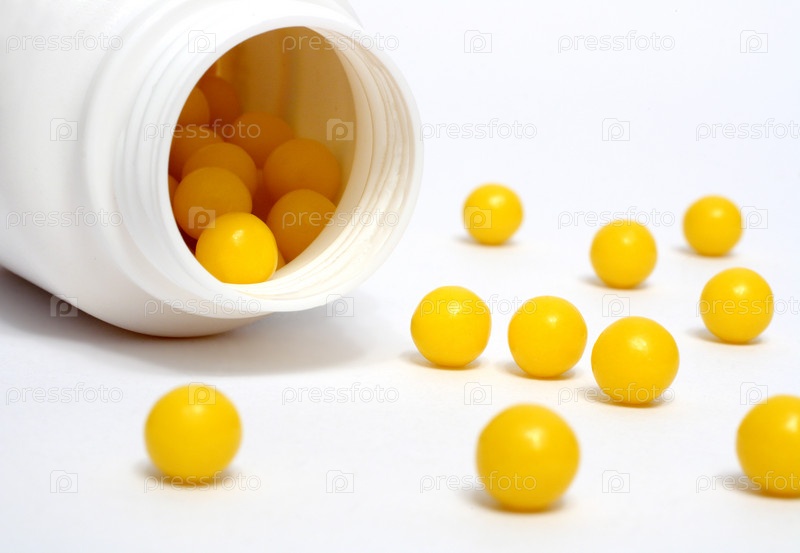 Желтые витамины, высыпанные из бутылочки на белом фоне