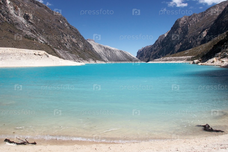 Песчаный берег Лагуны Парон, горы Кордильера Бланка, Перу