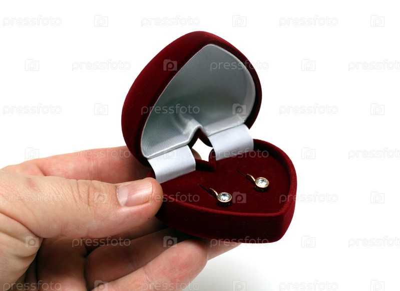 В руках подарочная коробочка с серьгами на белом фоне