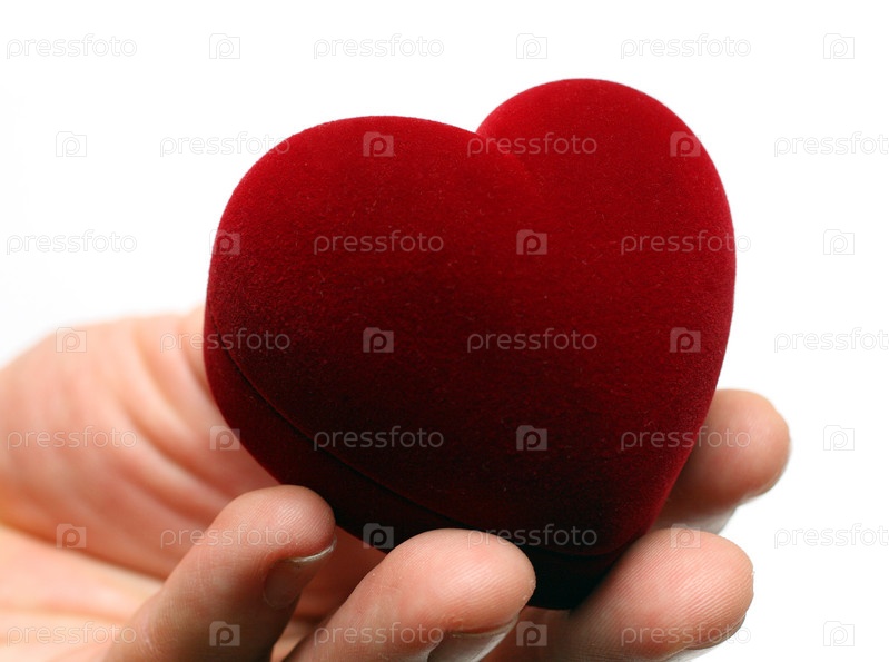 В руках подарочная коробочка в форме сердечка на белом фоне