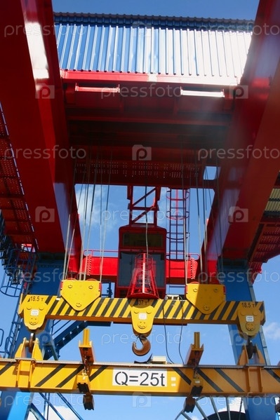 Красный, желтый и синий кран Голиаф загружает грузы на фоне чистого синего неба