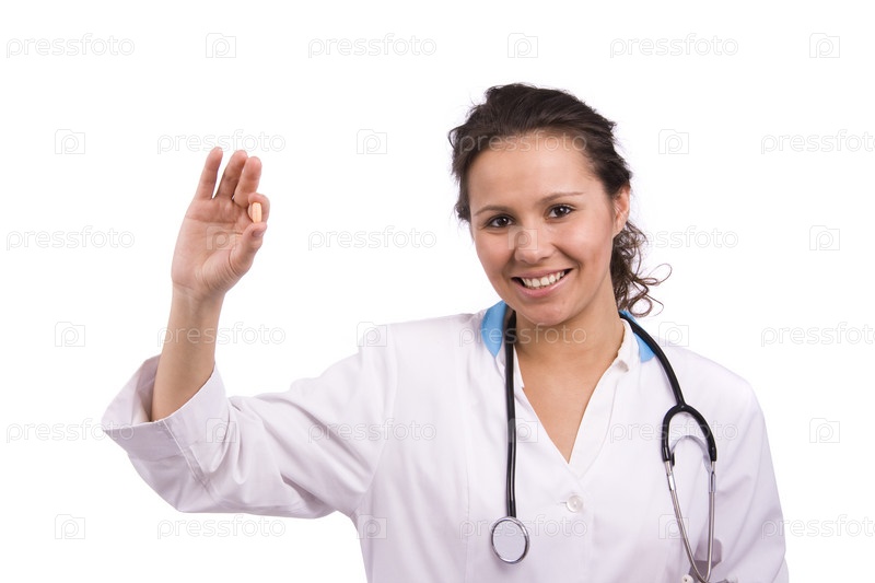 Медсестра держит маленькую оранжевую таблетку в своих пальцах.Фармацевт держат таблетки.Женщина-специалист по здравоохранению с рецептом