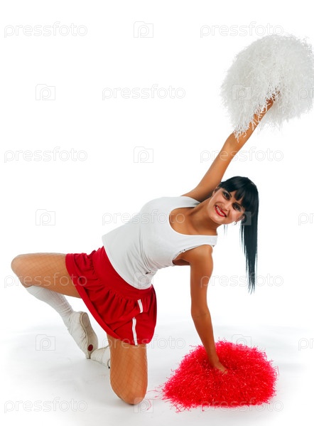 Девушка-чирлидер позирует в студии на белом фоне
