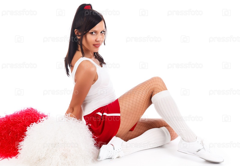 Девушка-чирлидер позирует в студии на белом фоне