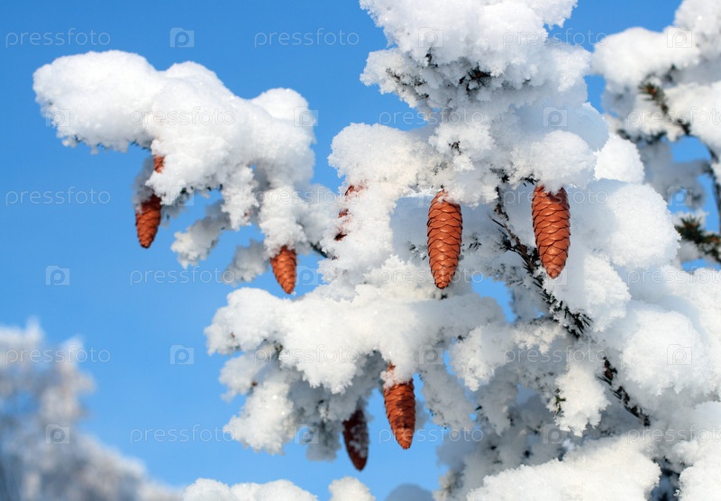 Шишки на заснеженной елке на фоне голубого неба