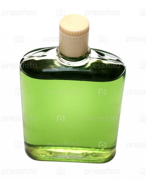 Стеклянная бутылка с зеленым одеколоном на белом фоне