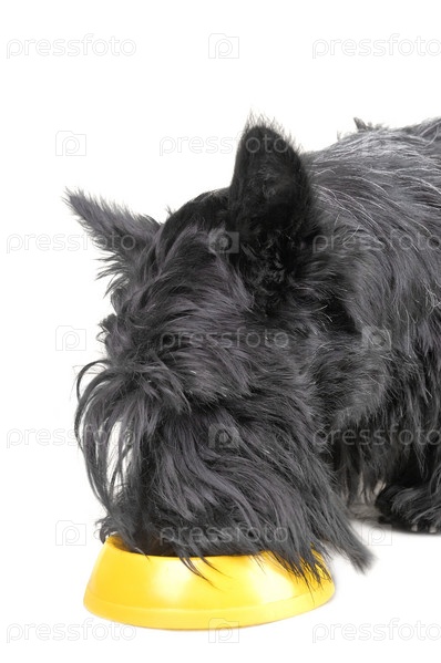 Шотландский терьер ест собачью пищу на белом фоне