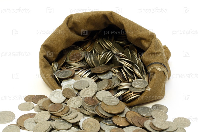 Монеты высыпаются из мешка на белом фоне