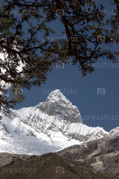 Ветка квенуального дерева с вершиной Невады Чакрараху на заднем плане.Кордилья Бланка, Анды, Перу