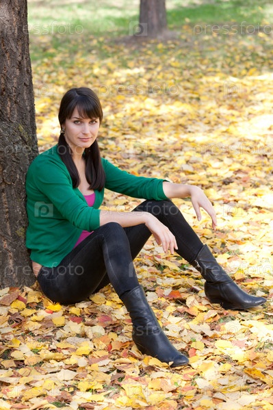 Привлекательная девушка сидит у дерева в парке