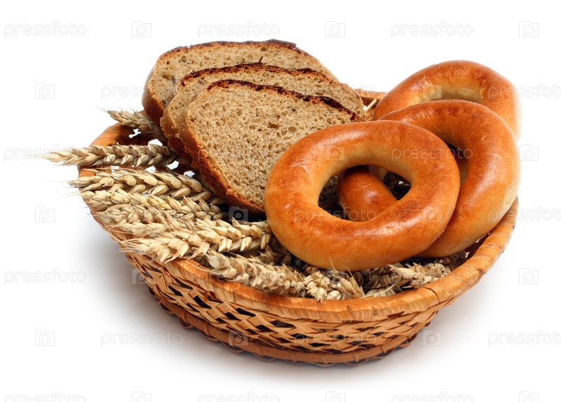 Колосья, хлеб и бублики в корзине, изолированы на белом