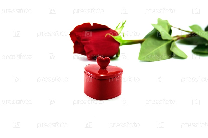 Подарочная коробочка и красная роза на белом фоне