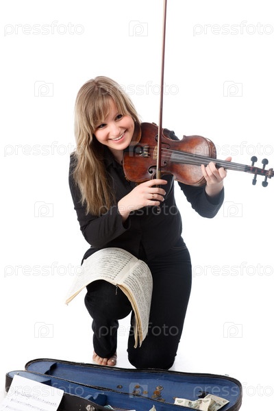 Молодая уличная скрипачка на белом фоне