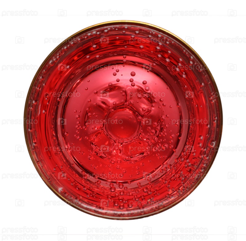 Стеклянный бокал с красной газированной водой на белом фоне. Вид сверху