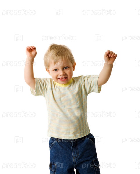 Радостный маленький мальчик на белом фоне