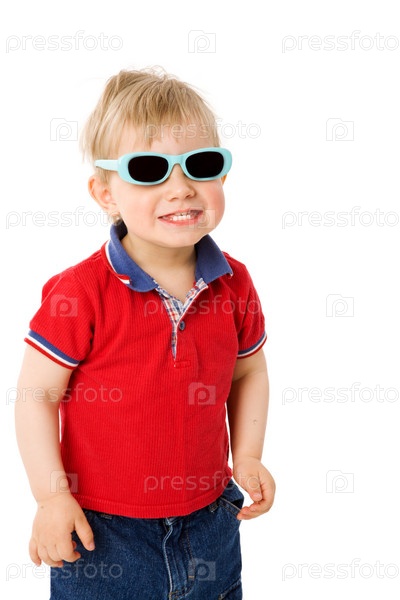 Маленький мальчик в темных очках на белом фоне