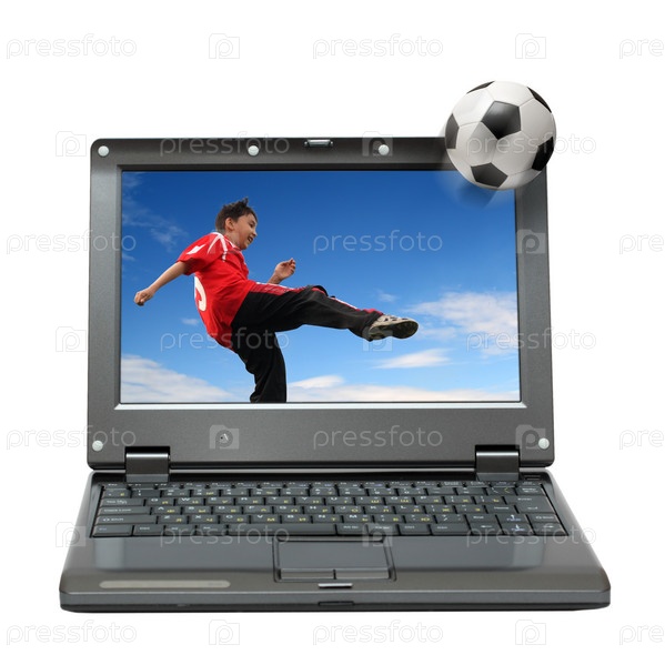 Футбольный игрок на экране ноутбука на белом фоне