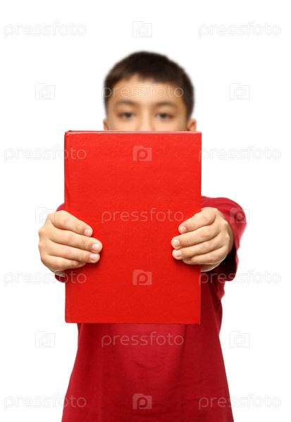 Мальчик с большой красной книгой на белом фоне
