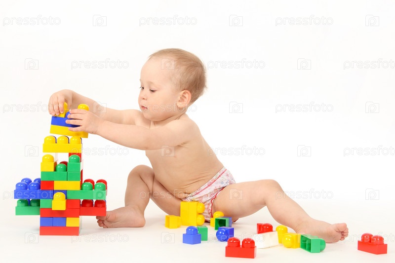 Маленький ребенок играет дизайнера на белом фоне