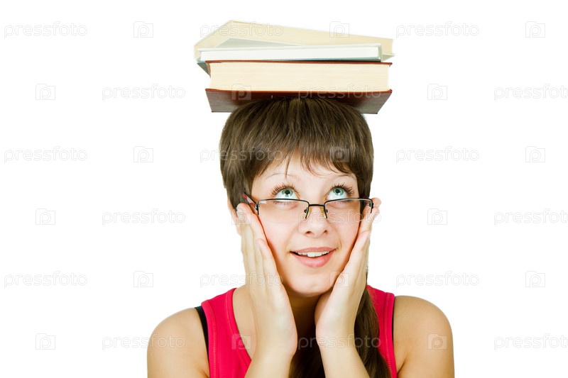 Красивая молодая голубоглазая девушка в очках с книгами на голове