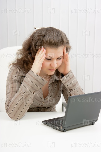 Уставшая предпринимательница в офисе с ноутбуком