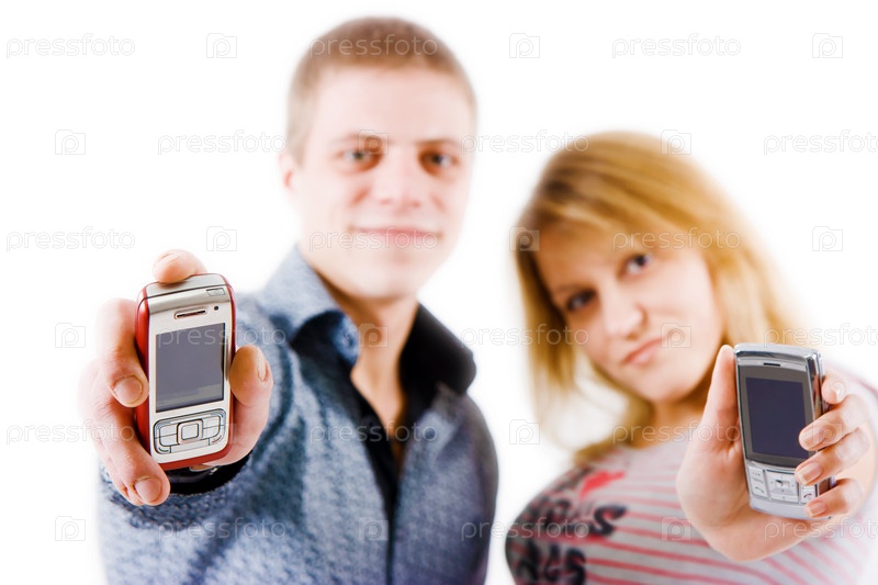 Девушка и молодой человек с мобильными телефонами