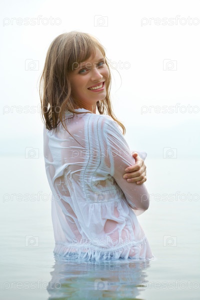 Девушка в белой блузке, стоящая по пояс в воде