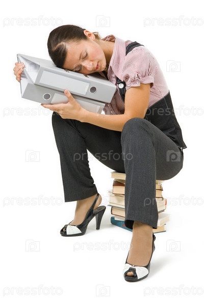Деловая женщина спит на папках