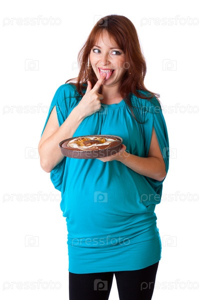 Улыбающаяся женщина пробует торт. Изолирована на белом фоне