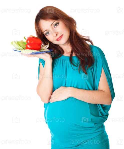 Беременная женщина с тарелкой овощей. Изолирована на белом фоне
