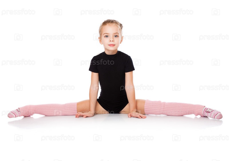 Маленькая девочка сидит на шпагате. Изолирована на белом фоне