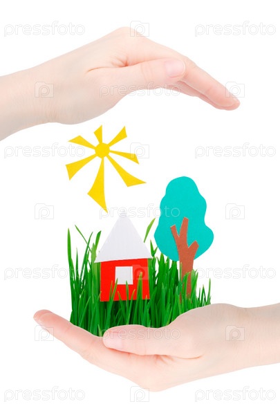 Дом, дерево, солнце и трава в руках изолированы на белом фоне