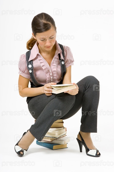 Девушка, сидящая на стопке книг