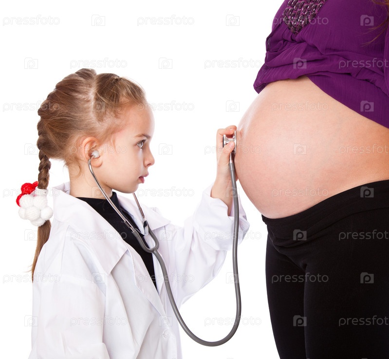 Девочка прослушивает живот своей беременной мамы. Изолирована на белом фоне