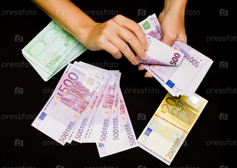 Валюта евро в руках на черном фоне
