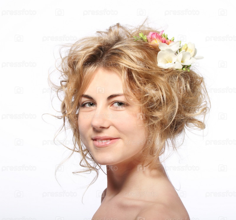 Красивая блондинка с фрезиями в волосах
