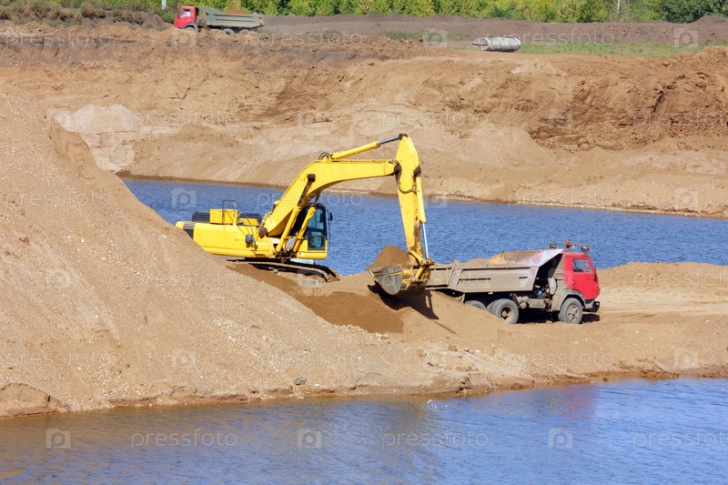 Экскаватор грузит песок в самосвал