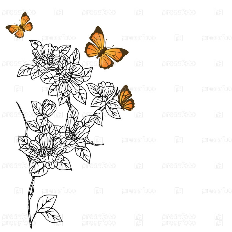 Черно-белый рисунок хризантемы и цветные бабочки, изолированные на белом фоне
