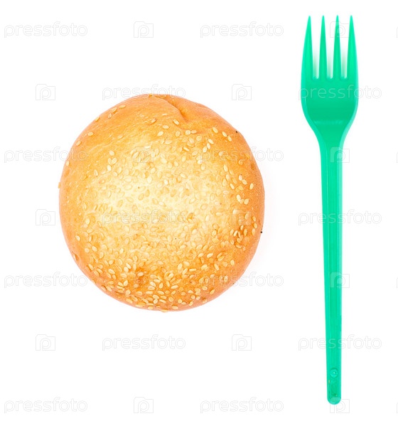 Булочка с кунжутом и пластиковая вилка на белом фоне