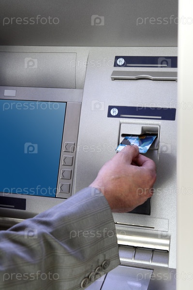 Человек вставляет кредитку в банкомат