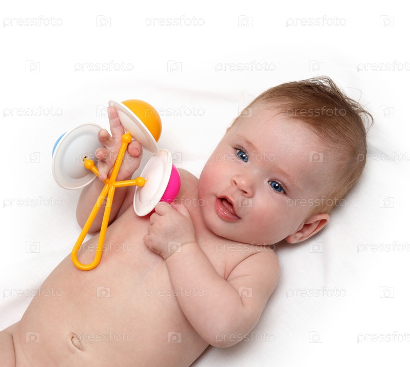 Очаровательный младенец с погремушкой в руках