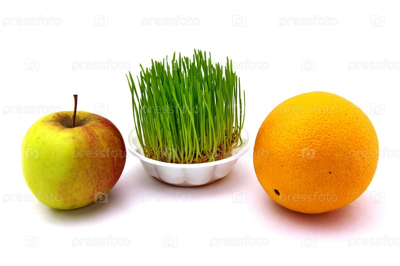Основа здоровой жизни - ростки пшеницы, яблоко и апельсин на белом фоне