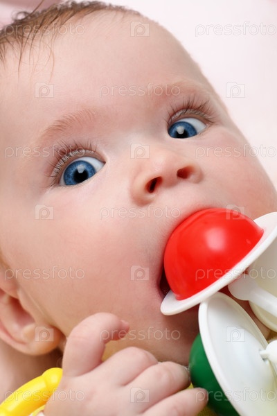 Очаровательный младенец с погремушкой в руках