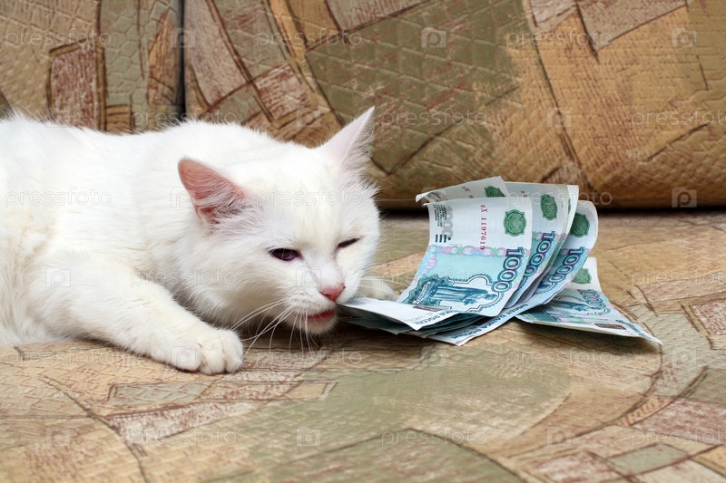 Белая кошка играет с тысячными купюрами