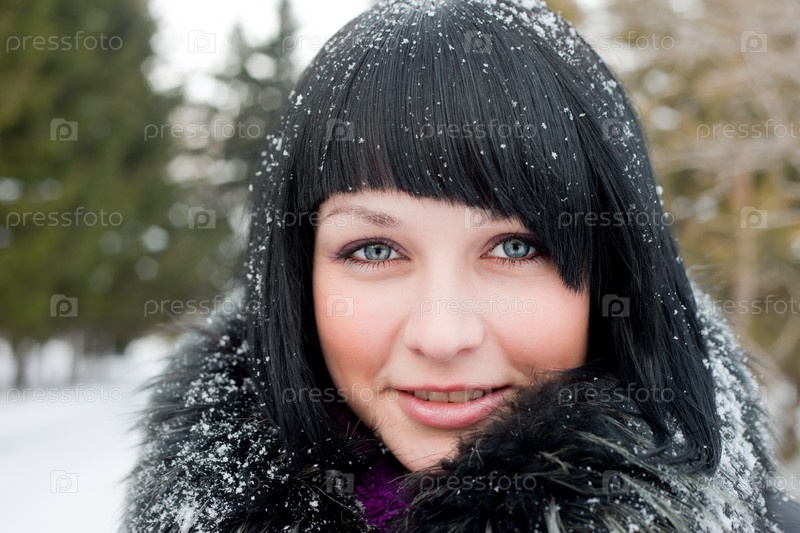 Портрет темноволосой улыбающейся девушки с заснеженными волосами