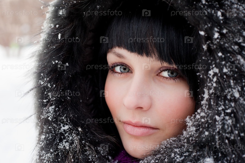 Портрет темноволосой девушки в заснеженном капюшоне
